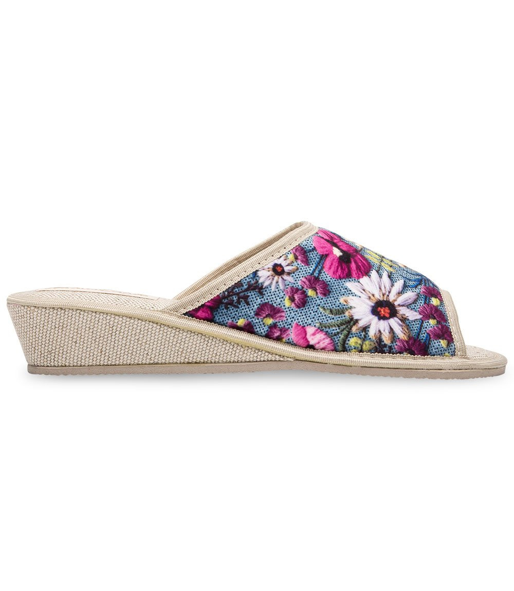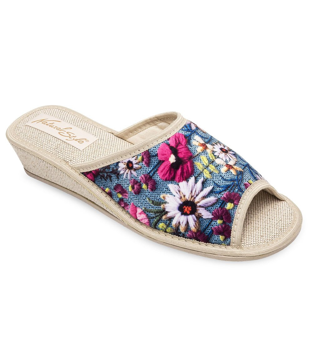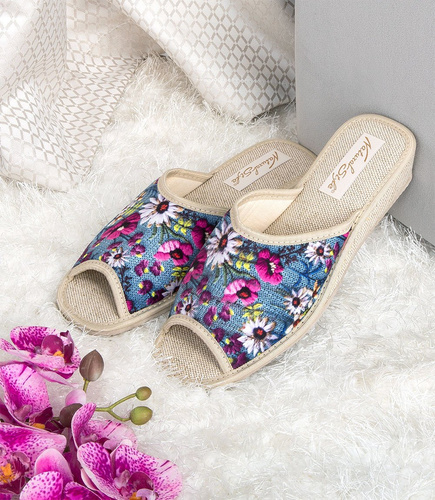 Obok naszego modelu naprawdę trudno przejść obojętnie. Głównie ze względu na jego ciekawą i niebanalną kolorystykę. O czym mowa? Te kapcie zachowane zostały w uniwersalnej, niebieskiej kolorystyce, która będzie idealna na każdą okazję. Nie jest to jednak model gładki i jednokolorowy. Wierzch butów ozdobiony został wielokolorowymi kwiatkami, które na jego powierzchni tworzą uroczą łączkę. Zdecydowanie jest to wybór dla pań, które lubią sprawdzone rozwiązania, a jednocześnie chcą pozostać na czasie.