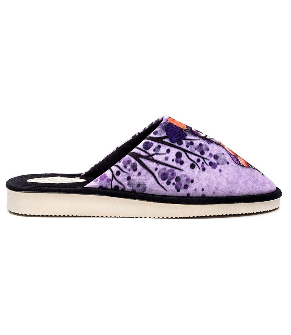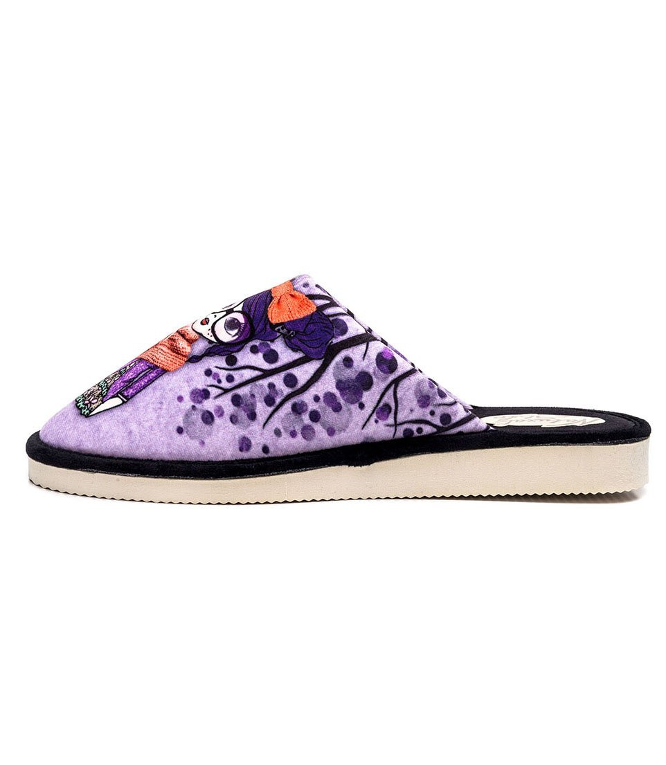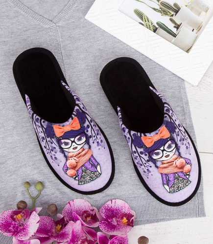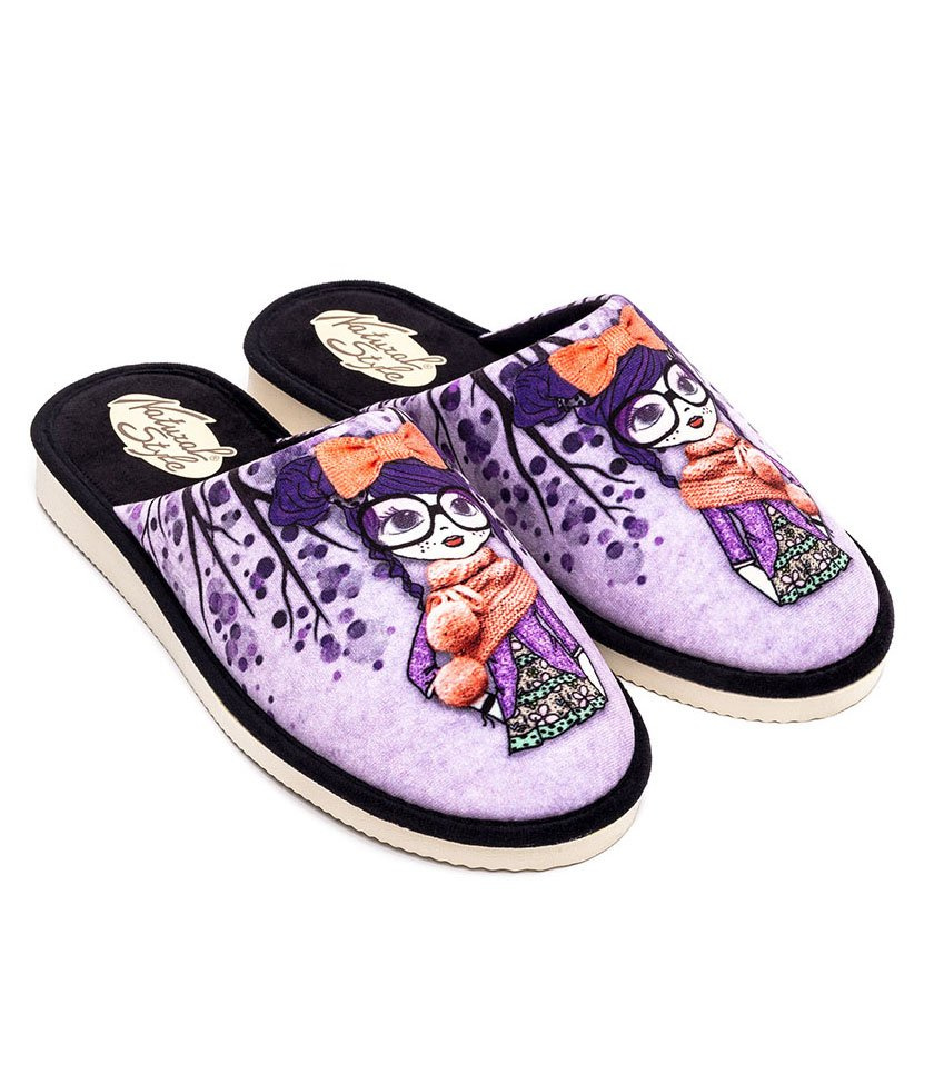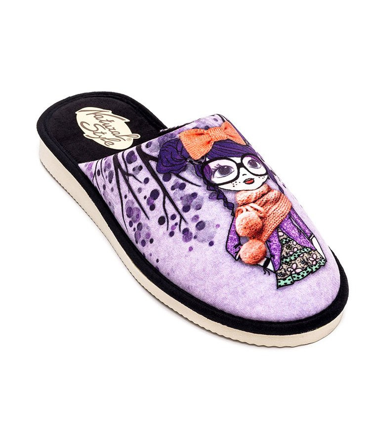 Kapcie polskiej marki Natural Style to fantastyczna opcja obuwia domowego na każdą okazję. Do ich bogatej oferty produktów dołączyła nowa seria papci z modnymi nadrukami, które zapewniają profesjonalne wykończenie i nieskończoną ilość ciekawych pomysłów projektów. Jedną z propozycji stanowi model, łączący w sobie kompozycję trzech kolorów: czerni, fioletu i pomarańczowych dodatków, które zostały dobrane na znanej zasadzie kontrastu. Print sam w sobie łączy kobiecość i dziewczęcość, dzięki filigranowej postaci w okularach, opatulonej szalem. Cały obraz wywołuje wrażenie jesiennego pejzażu, co uzasadniałoby wybór ubrania bohaterki papci. Kapcie sprawdzą się jednak nie tylko podczas jesiennej aury, ale na cały rok!